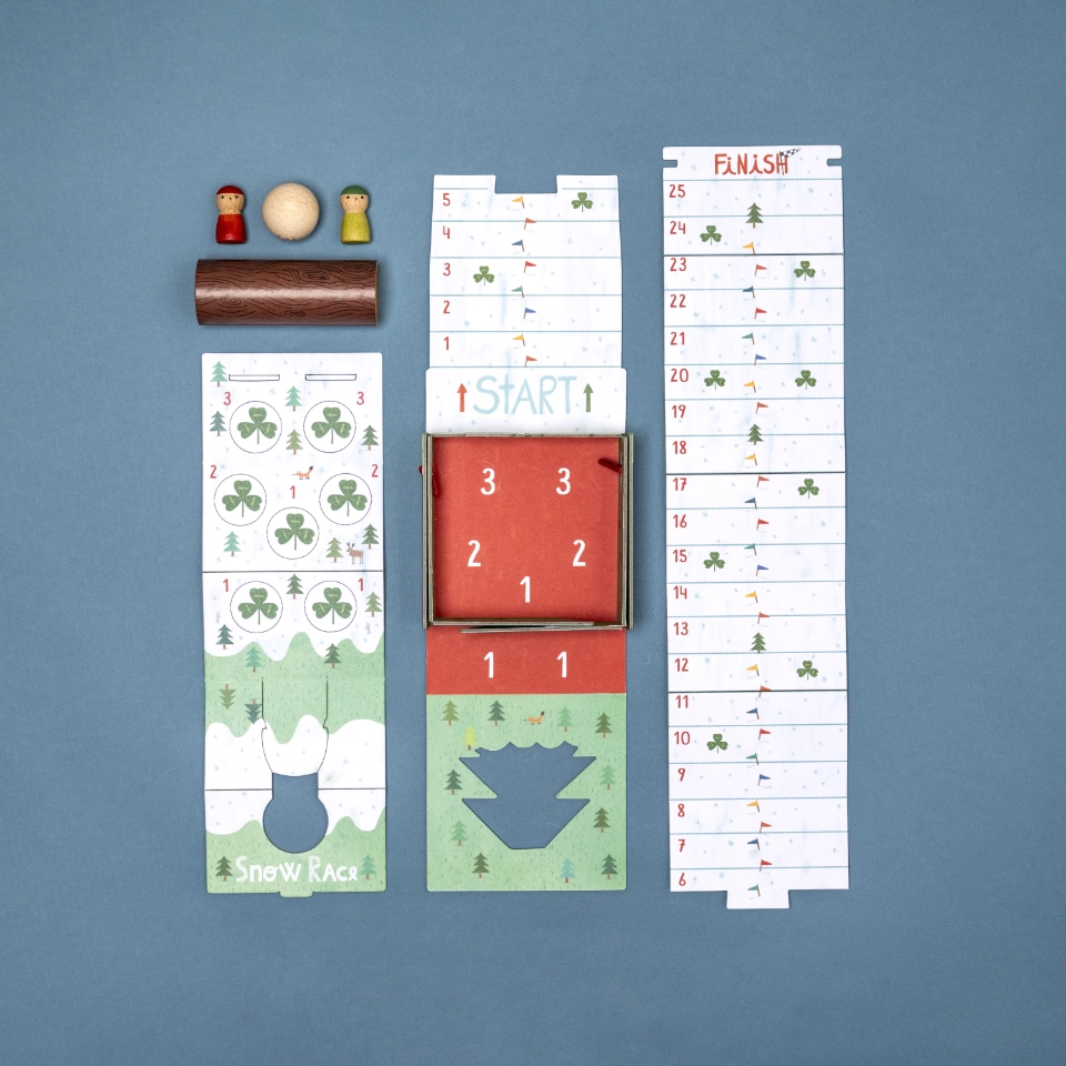 Sett deg på sleden og bli med ned bakken i et lekent kappløp hvor terningkast og små oppgaver avgjør hvem som kommer først i mål.