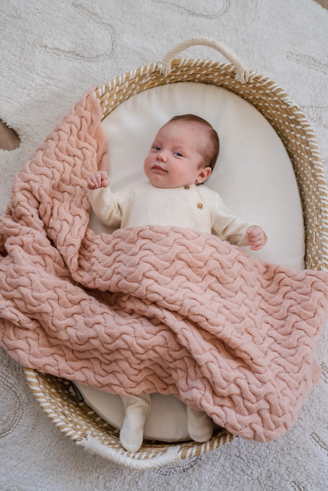 Teppet har en tykk og moderne strikk som gir både varme og et tidløst uttrykk. Perfekt i vognen, i sengen eller som et mykt lag hjemme.